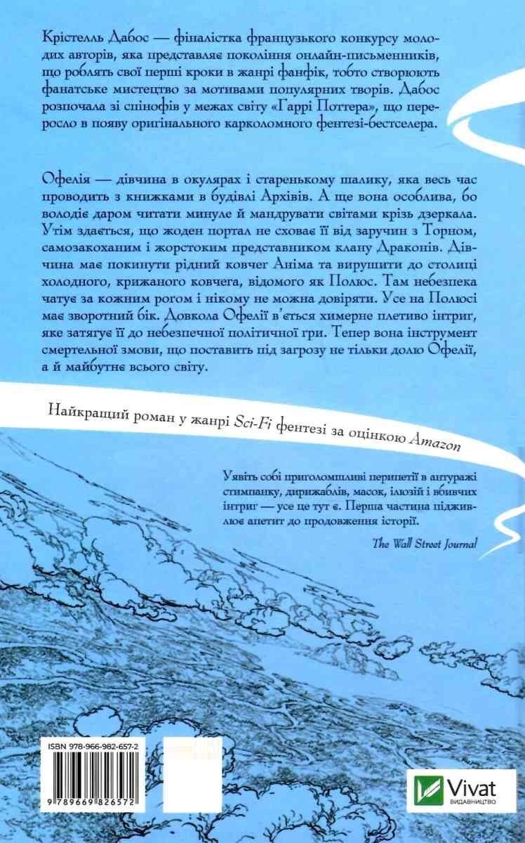 Офелія — дівчина в окулярах і старенькому шалику, яка весь час проводить з книжками в будівлі Архівів. А ще вона особлива, бо володіє даром читати минуле й мандрувати світами крізь дзеркала. Утім здається, що жоден портал не сховає її від заручин з Торном, самозакоханим і жорстоким представником клану Драконів. Дівчина має покинути рідний ковчег Аніма та вирушити до столиці холодного, крижаного ковчега, відомого як Полюс. Там небезпека чатує за кожним рогом і нікому не можна довіряти. Усе на Полюсі має зворотний бік. Довкола Офелії в’ється химерне плетиво інтриг, яке затягує її до небезпечної політичної гри. Тепер вона інструмент смертельної змови, що поставить під загрозу не тільки долю Офелії, а й майбутнє всього світу.