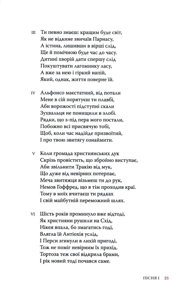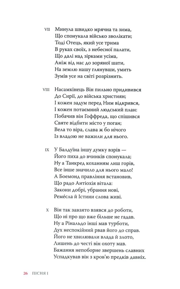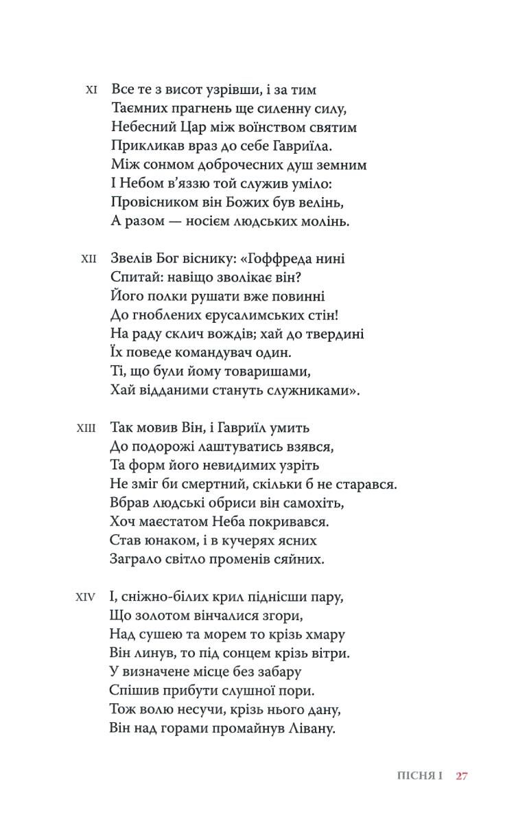 Увазі читача пропонується перший повний український переклад великої епічної поеми славетного італійського поета Торквато Тассо «Визволений Єрусалим» (вперше надрукована 1581 року). Поема, у якій розповідь про події та героїв Першого хрестового походу та відвоювання Єрусалима в «невірних» чергується із захопливими фантастичними та пригодницькими історіями, була улюбленим чтивом європейців упродовж понад двохсот років. На її сюжети писали свої літературні твори, картини й опери численні письменники, митці та композитори наступних століть. Справила поема неабиякий вплив і на українських читачів доби бароко. Самійло Величко переповідає її частину в своєму «Літописі», а переклад староукраїнською мовою її перших десяти пісень з’явився ще наприкінці XVII століття. Без знання поеми Тассо неможливо зрозуміти багато сюжетів того, що називається «європейською культурою».