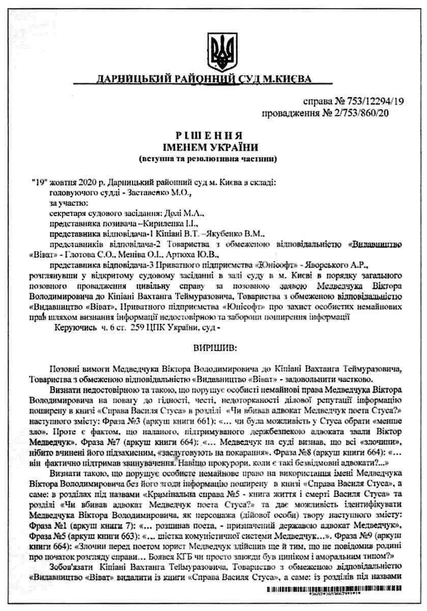 Правда про кримінальну справу, життя і смерть Василя Стуса. У книжці зібрано архівні документи з кримінальної справи Василя Стуса, адвокатом якого був Віктор Медведчук, покази свідків, листи поета з тюрми, спогади його рідних та друзів. Ознайомившись із наведеними матеріалами, читачі дізнаються про невідомі факти щодо життя, ув’язнення та загибелі Стуса, які досі охороняли під грифом «Секретно».