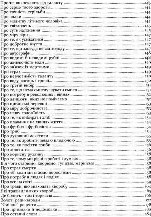 Ця книжка - продовження циклу ("Многії літа. Благії літа", "Вічник", "Світован", "Синій зошит") про дивовижного карпатського старця Андрія Ворона. У ній - крихти його мудрих роздумів, спогадів, передбачень, одкровень і порад, як жити довго в здоров'ї, щасті, спокої і радості. Себто філософія життя для кожної людини і на кожен день.