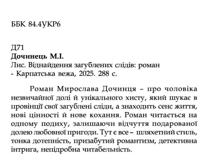 Роман Мирослава Дочинця про чоловіка незвичайної долі й унікального хисту, який шукає в провінції свої загублені сліди, а знаходить сенс життя, нові цінності й нове кохання. Роман читається на одному подиху, залишаючи відчуття подарованої долею любовної пригоди. Тут є все — шляхетний стиль, тонка дотепність, призабутий романтизм, детективна інтрига, непідробна читабельність.