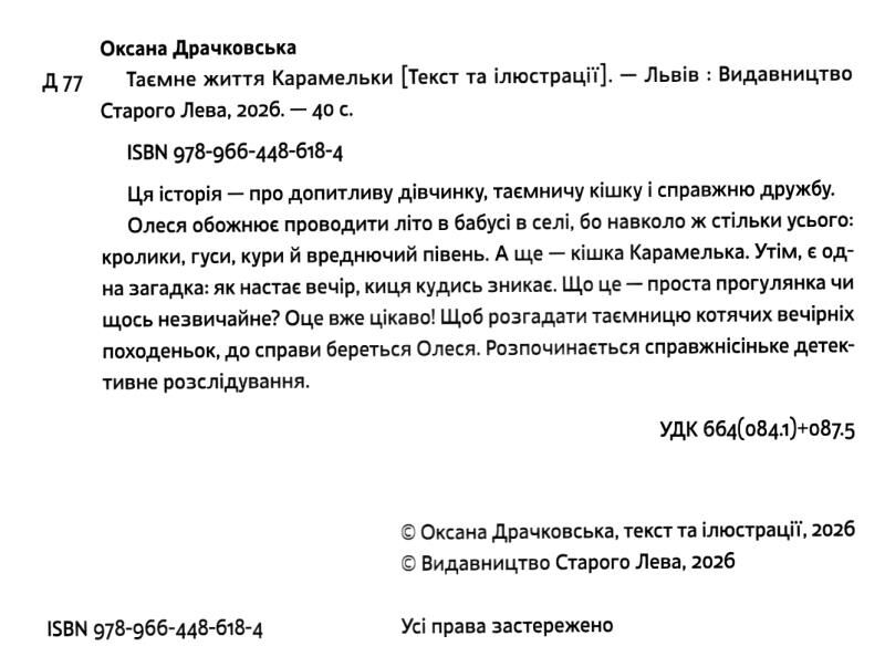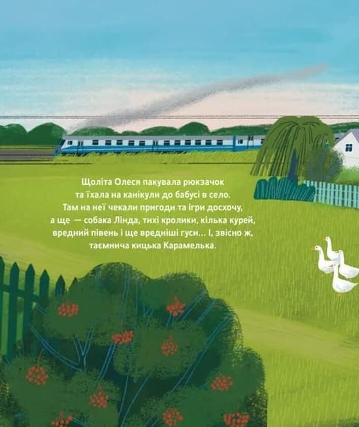 Олеся обожнює проводити літо в бабусі в селі, бо навколо ж стільки усього: кролики, гуси, кури й вреднючий півень. А ще — кішка Карамелька. Утім, є одна загадка: як настає вечір, киця кудись зникає. Що це — проста прогулянка чи щось незвичайне? Оце вже цікаво! Щоб розгадати таємницю котячих вечірніх походеньок, до справи береться Олеся. Розпочинається справжнісіньке детективне розслідування.
