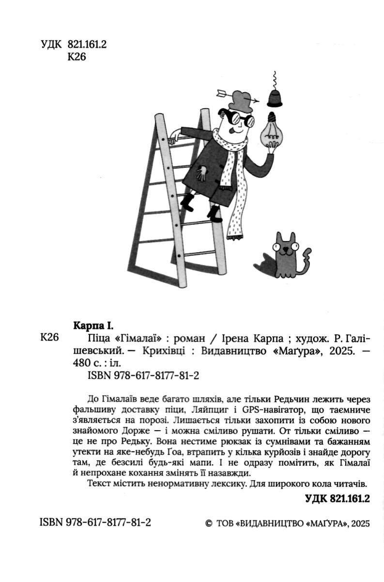 Книга Піца Гімалаї — це захоплива пригода з неочікуваною зав'язкою, сповнена гумору, екшну та філософських підтекстів. Головна героїня на ім'я Редька отримує загадкового листа. За кілька хвилин у двері дзвонить, а за порогом — невідомий пакунок із дорогим GPS-навігатором. Саме з цього моменту починається її шлях до самопізнання та втечі від повсякденної буденності.