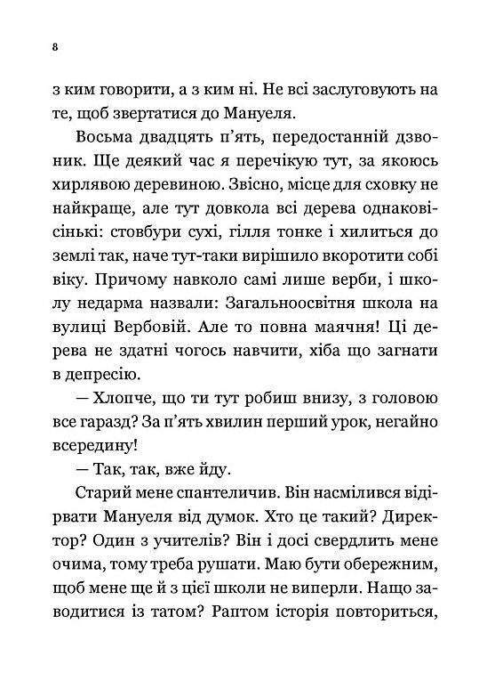 У попередній школі з Мануелем Россі всі хотіли дружити. Його завжди помічали й боялися. Нині ж проти нього цілий світ. Серед нових однокласників хлопець стає невидимим. Досі він міг робити боляче іншим. Тепер йому щодня роблять боляче інші. Адже немає нічого гіршого від самотності, коли тобі чотирнадцять і ти прагнеш запалювати серця. Мануель складає амбітний план. Та замість «прицілитися, влучити, потопити» тутешніх учнів — із ганьбою сідає в калюжу. А те, що відбувається в цій школі… скидається на театралізовану виставу для одного глядача.