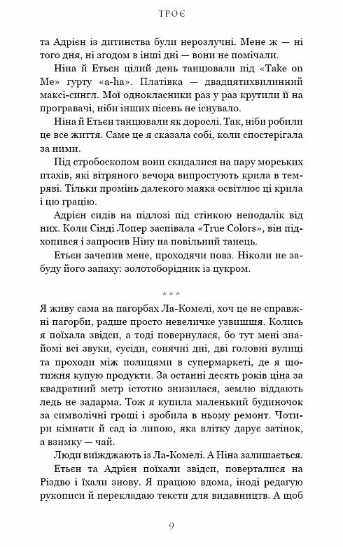 Аматорський музичний гурт «Троє» скидається на юних Курта Кобейна, Боба Ділана та Одрі Гепберн. Вони знайомляться з веління випадку в середній школі, здружуються й поволі второпують, що стають одним цілим, не мислячи життя окремо. Однак життя випробовує і їхню дружбу, і волю кожного з них. Красунчик і ловелас Етьєн, зрісши в розкошах, лише на порозі смерті розуміє, що єдиним скарбом його життя є син. Осиротіла ще до повноліття Ніна, прагне домашнього затишку, утім зазнає наруги, тож розрадою стають коти й собаки із притулку, такі само покинуті й самотні, як і вона. Сором’язливий і мовчкуватий Адрієн реалізується як драматург, проте загальне визнання робить його ще більшим самітником. А хто ж ця таємнича й загадкова Віржині, яка оповідає цю історію шкільних років і юнацтва тих трьох? І чи має вона місце в їхній дружбі? Валері Перрен щемливо окреслює найдражливіші питання становлення юні: ідентичність, сексуальність, дружба, кохання та відданість. І найважливіше з-поміж цього — відвага бути собою.