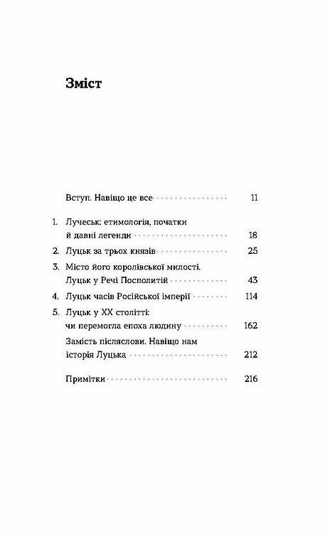 Олександр Котис у своїй книжці не просто змальовує основні віхи історії Луцька, він фактично знайомить нас із життям міста за різних часових періодів і тими, хто творив його сучасний ландшафт. Стартуючи в центрі Луцька, автор проводить нас вуличками міста, вміло балансуючи поміж легендами й історичними фактами. Він не обмежується оповідями про величні храми та замки, а водночас розповідає, якими стежками гуляли місцеві монахи та якими свого часу були особливості політики, як вигравалися битви і забудовувалося місто.