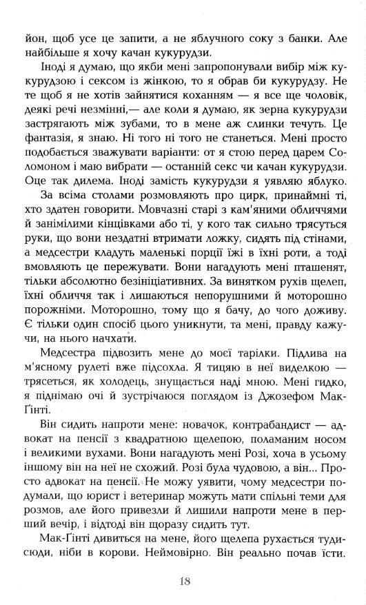 Джейкоб сумлінно відвідував лекції в університеті та готувався до скромної кар’єри доктора ветеринарної медицини. Та в долі були свої плани щодо нього. Втративши все, хлопець у буквальному сенсі вскочив у потяг — як виявилось згодом, цирковий. Саме цирк подарує йому друзів, кохану, професію і навіть слониху! Саме цирк навчить його протистояти злу і нічого не боятися. Через 70 років Джейкоб до найменших дрібниць згадає цю неймовірну мандрівку, ні про що не шкодуючи. Яскрава, драматична, щемлива історія з геть несподіваним і життєствердним фіналом.