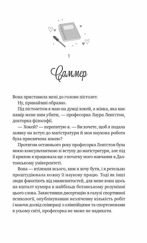 Саммер Престон — відмінниця з амбітними планами. Вона мріє стати спортивною психологинею та вступити до аспірантури. Для цього дівчині потрібно зробити хокей темою дослідження. Саммер ненавидить цю гру, однак наукова консультантка ставить перед нею ультиматум: або вона долає своє упередження, або втрачає місце в аспірантурі. Тим часом необачна помилка капітана хокейної команди Ейдена Кроуфорда ставить під загрозу весь сезон. Тому тренер придумує для нього справжнє покарання: хлопець стане головним об’єктом дослідження Саммер. Це — останнє, що він хотів би робити, тим паче що дослідниця неначе готова пожбурити в нього ковзанами. Та й сам Ейден цілковито підтверджує найгірші припущення Саммер про хокеїстів — думає лише про гру, запальний, безцеремонний. Їм доведеться терпіти одне одного, допоки пристрасть між ними не розтопить лід.