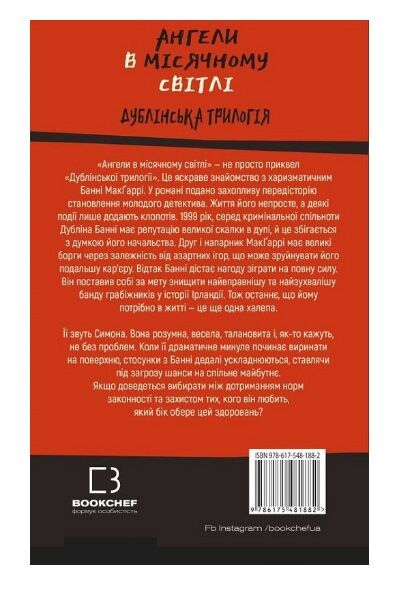 «Ангели в місячному світлі» — не просто приквел «Дублінської трилогії». Це яскраве знайомство з харизматичним Банні МакҐаррі. У романі подано захопливу передісторію становлення молодого детектива. Життя його непросте, а деякі події лише додають клопотів. 1999 рік, серед кримінальної спільноти Дубліна Банні має репутацію великої скалки в дупі, й це збігається з думкою його начальства. Друг і напарник МакҐаррі має великі борги через залежність від азартних ігор, що може зруйнувати його подальшу кар’єру. Відтак Банні дістає нагоду зіграти на повну силу. Він поставив собі за мету знищити найвправнішу та найзухвалішу банду грабіжників у історії Ірландії. Тож останнє, що йому потрібно в житті — це ще одна халепа.