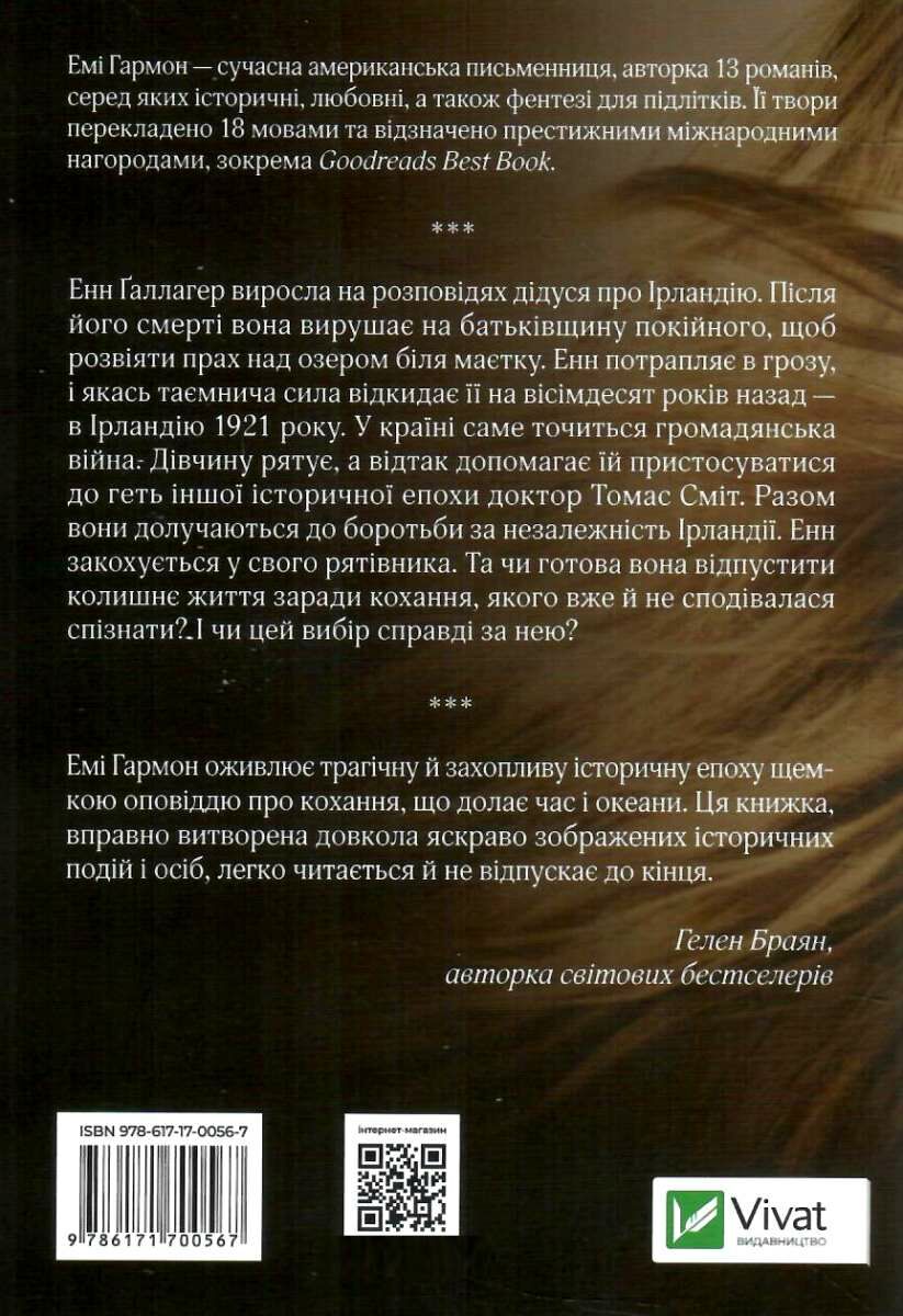 Енн Ґаллагер виросла на розповідях свого дідуся про Ірландію. Після його смерті вона вирушає на батьківщину покійного, щоб розвіяти прах над озером біля маєтку. Енн потрапляє в грозу, і якась таємнича сила відкидає її на вісімдесят років назад — в Ірландію 1921 року. У країні саме точиться громадянська війна. Дівчину рятує, а відтак допомагає їй пристосуватися до геть іншої історичної епохи доктор Томас Сміт. Разом вони долучаються до боротьби за незалежність Ірландії. Енн закохується у свого рятівника. Та чи готова вона відпустити колишнє життя заради кохання, якого вже й не сподівалася спізнати? І чи цей вибір справді за нею?