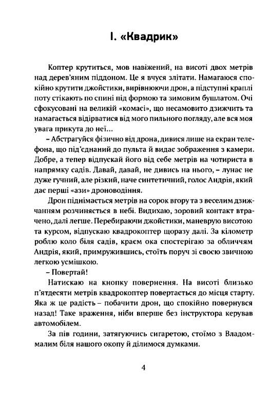 У повісті полковника Збройних сил України, доктора технічних наук, професора Андрія Тристана в художній формі описано, як група харківських військових-науковців від початку нападу російської армії освоюють нову зброю, що вперше використовується у російсько-українській війні та за якою майбутнє, – дрони. Вони воюють, водночас експериментують, шукають ефективних методів застосування дронів у бойових діях, інколи помиляючись, але досягаючи потрібних результатів у жорстокій війні з підступним ворогом. Автор сам брав участь в описаних подіях.