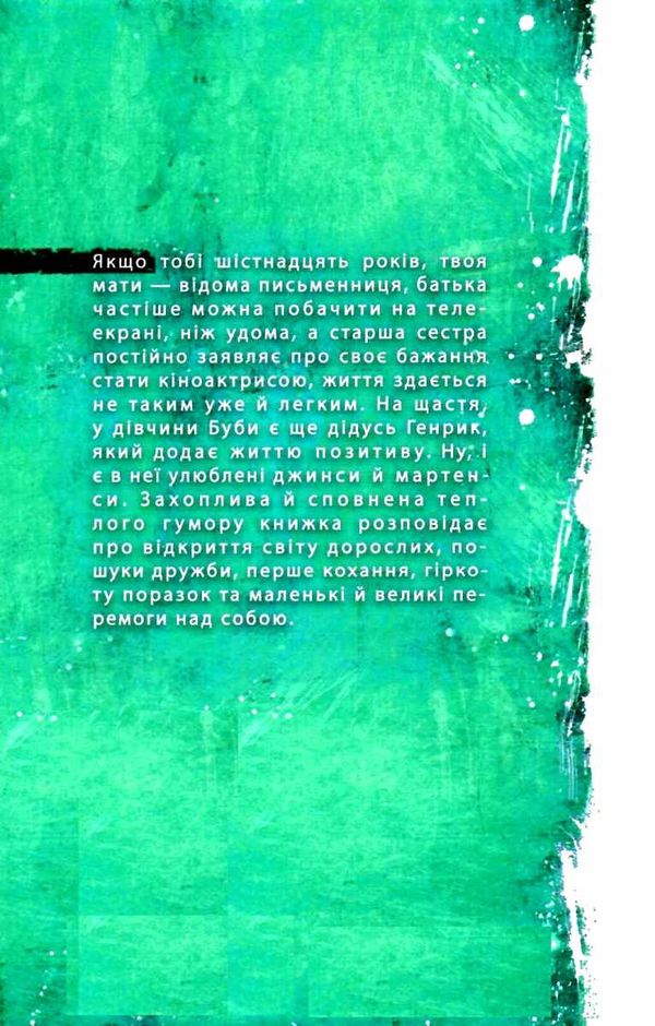 Якщо тобі шістнадцять років, твоя мати — відома письменниця, батька частіше можна побачити на телеекрані, ніж удома, а старша сестра постійно заявляє про своє бажання стати кіноактрисою, життя здається не таким уже й легким. На щастя, у Буби є ще дідусь Генрик, який додає життю позитиву. Ну, і є в неї улюблені джинси й мартенси. Захоплива й сповнена теплого гумору книжка розповідає про відкриття світу дорослих, пошуки дружби, перше кохання, гіркоту поразок та маленькі й великі перемоги над собою.