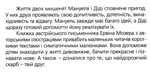 Життя двох мишенят Мануеля і Діді сповнене пригод. У них друзі проявляють свою допитливість, дотепність, винахідливість та відвагу. Мануель завжди має багато ідей, а Діді щоразу готовий допомогти йому реалізувати їх. Книжка австрійського письменника Ервіна Мозера з авторськими ілюстраціями привабить маленьких читачів короткими текстами і симпатичними малюнками. Вона допоможе дітям знаходити у житті дивовижне, бачити прекрасне і пізнавати нове. А також – дізнатися про те, що найдорожчий скарб – твій друг.