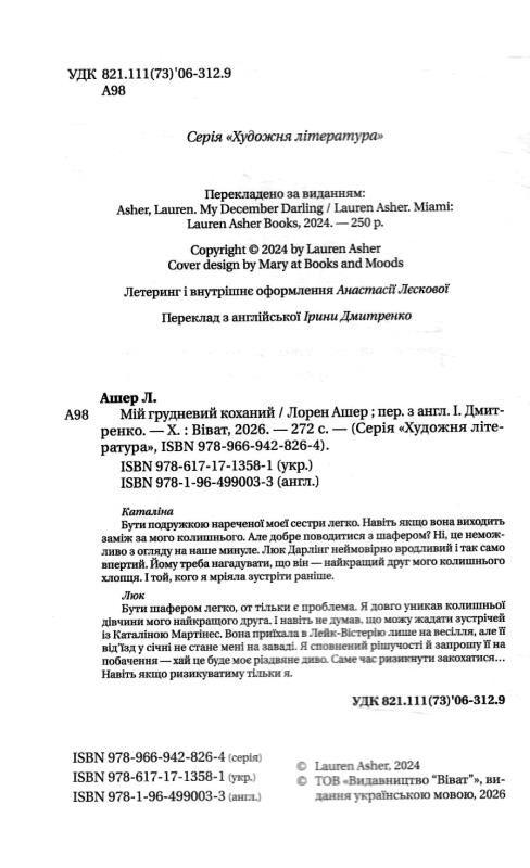 «Мій грудневий коханий» — це любовна історія від американської авторки Лорен Ашер про подолання емоційних бар’єрів у романтичних стосунках. У зимовому маленькому містечку невдовзі розгортатиметься справжня драма. Каталіна Мартінес — дружка своєї сестри. Гадалося б, супроводжувати близьку людину у такій важливій життєвій подорожі є справжньою радістю. Та під вінцем на наречену чекатиме ніхто інший, як колишній Каталіни! Шафером цього парубка буде Люк — чоловік із мрій головної героїні. Цього року він ризикне усім, щоб здобути серце дівчини, яку так довго уникав. Каталіна Мартінес повертається до рідного містечка, щоб стати дружкою на весіллі своєї сестри Габріели. Справа набуває несподіваних обертів, коли з’являється Люк Дарлінг — шафер нареченого та його найкращий друг, з яким героїня має беззаперечну хімію і бурхливе спільне минуле. Почуття можуть стати на заваді для Каталіни, адже зараз дівчина прагне тільки спокою.