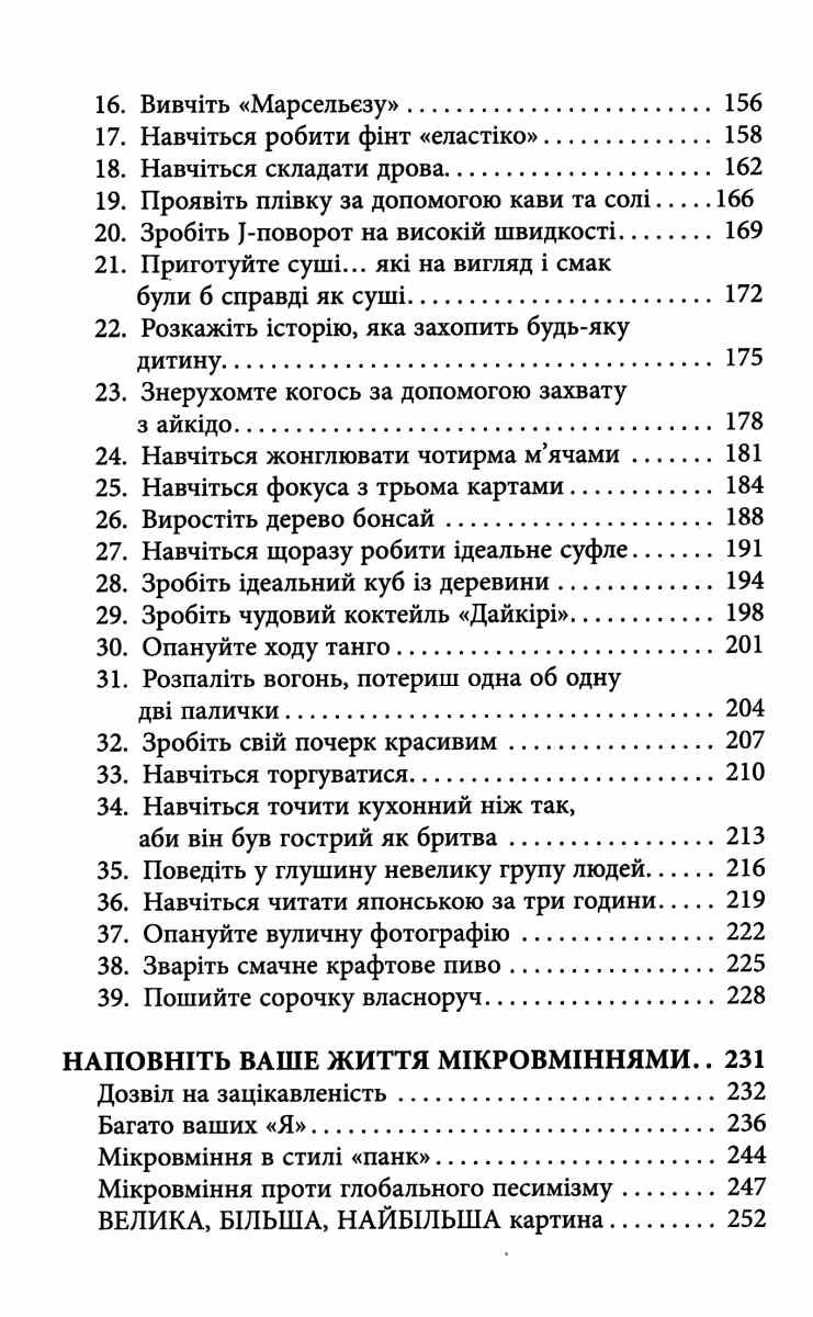 Забудьте про 10 000 годин напруженої практики, які необхідно витратити, щоби опанувати якесь одне вміння! Справжній шлях до успіху та досягнень полягає в прагненні вдосконалити безліч мікровмінь — до того ж із користю. Поєднуючи нейронауку, позитивну психологію, самодопомогу, багато цікавих фактів та зрозумілі ілюстрації, ця чудова книжка заохочує відкинути всі ті причини, через які ми «не можемо» вчитися та розвиватися — це занадто складно, нам бракує часу, ми не експерти, це треба починати в юному віці,— завдяки корисним і приємним умінням. Бажаєте опанувати кулінарне мистецтво — почніть із приготування ідеального омлету. Хочете навчитися танцювати — почніть із ходи танго. Прагнете стати більш креативним, розумним і щасливим — прочитайте цю книжку!
