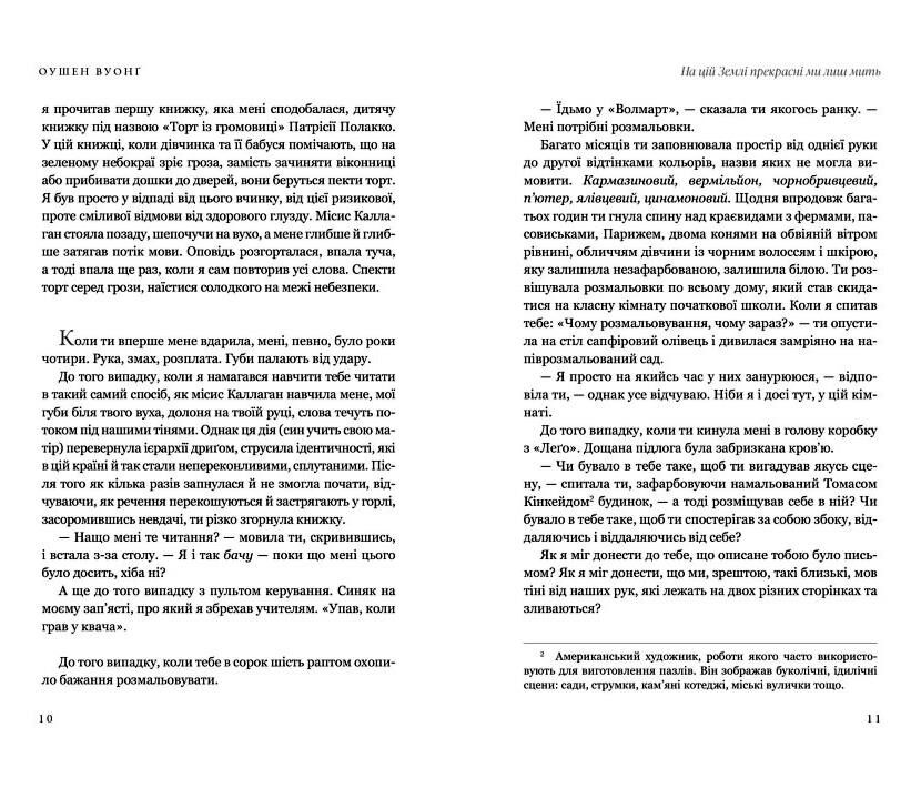 На цій Землі прекрасні ми лиш мить — це емоційно насичений роман-сповідь, написаний у формі листа сина до своєї матері. Автор Оушен Вуонґ надзвичайно тонко зобразив зв’язок між поколіннями, перетворивши просте письмо у витончену лірику, яка торкається душі. Про що книга Головний герой, на прізвисько Цуцик, звертається до матері, яка не вміє читати. У своєму посланні він розповідає історію їхньої родини, яка бере початок ще у В’єтнамі. Через особисту історію автор занурює читача у біль і красу емігрантського життя, досвід дорослішання серед ізоляції, нерозуміння, але й глибокої любові. Цей автобіографічний роман відкрито підіймає питання расової ідентичності, маскулінності, класових відмінностей і насильства. У той же час він пронизаний відчуттям крихкості людського буття й пошуків любові, тепла, душевного прийняття.