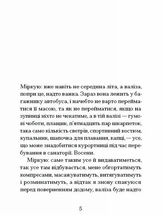 Сюжет цієї повісті на позір доволі простий. Недужа жінка прибуває на реабілітацію, зазнає іще травмування, повертається додому знесилена. Однак це не все. Вона таки зазнала й дива, воно її відшукало і сталося. Спомини з минулого і відкриття своєї сексуальності в санаторії для підлітків тісно переплітаються з утисками й наругою, яких Каміла зазнає нині — у реабілітаційному закладі, куди мусить їхати за рекомендацією соцстрахування, інакше її позбавлять виплат і звільнять з роботи.