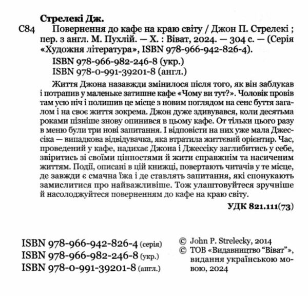 Про автора: Джон П. Стрелекі — популярний американський письменник, автор кількох міжнародних бестселерів. Продажі його книжок перевищили позначку в 6 мільйонів примірників, і кількість прихильників невпинно зростає. Його твори перекладено 42 мовами. Джон П. Стрелекі роками працював стратегічним радником для компаній та урядів у всьому світі. Разом з Опрою Вінфрі, Тоні Роббінсом та Діпаком Чопрою він входить до ста визначних постатей у галузі лідерства та особистісного розвитку, які надихають найбільше.