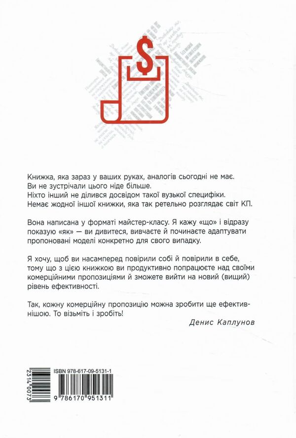 Автор цієї книжки, відомий український копірайтер, упевнений: комерційні пропозиції працюють! Звісно, якщо відповідально ставитися до їх складання. Написана у формі майстер-класу, ця книжка містить десятки кейсів із власного досвіду Дениса Каплунова. Автор щедро ділиться тонкощами створення ефективних комерційних пропозицій. Читачеві залишається тільки скористатися конкретними порадами і вийти на новий рівень власної ефективності.