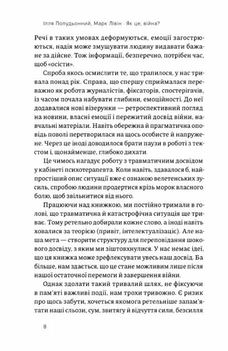 Книжка фокусується на першому півріччі повномасштабного вторгнення. Авторам було важливо створити матеріал для переповідання досвіду травми, а також зафіксувати, назвати і пояснити, що відбувалось з людьми із психологічної та соціальної точки зору. Саме такий фокус книжки «Як це, війна?». Тут ви знайдете особисті історії авторів про передчуття і початок повномасштабного вторгнення, намагання осягнути все, що відбувалось, та їхні спостереження стосовно цих подій на основі психологічної теорії. У розділах, що стосуються складних і вразливих тем, своїм досвідом поділилися партнери з проєктів Veteran Hub і «Сильні». Окремі важливі елементи — #пігулкисвітла вкінці кожного розділу — мініісторії людей, які є свідченням доброти, вразливості, гумору і сили. Кожен із нас, мабуть, ставив собі питання: «Ну як це, війна?». Прийняти нову реальність, у якій щодня ворожі ракети цілять у дитячі садочки, школи, лікарні та звичайні цивільні багатоповерхівки, дуже складно.