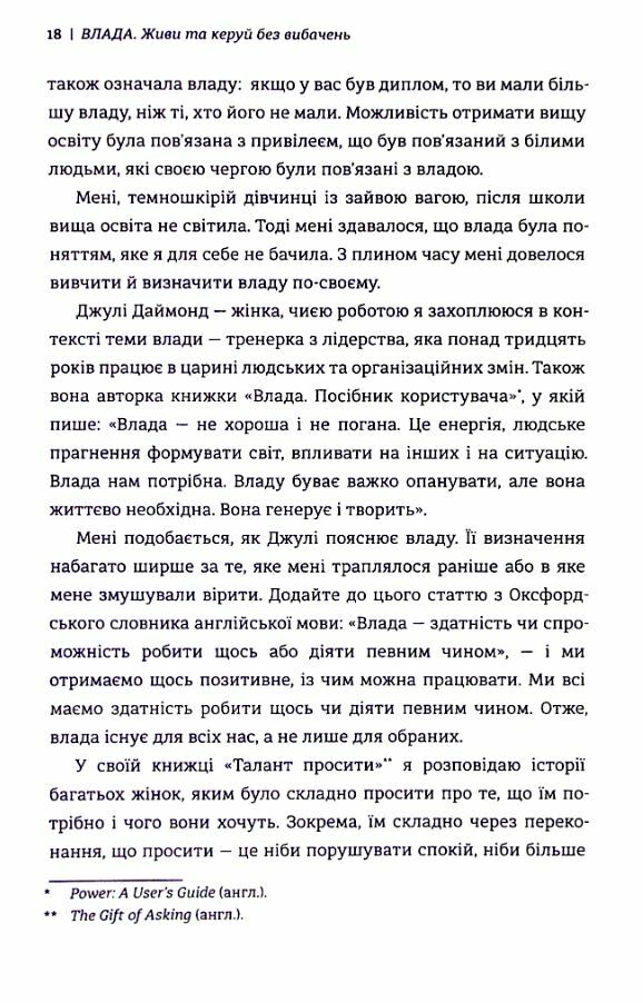 Влада: посібник для жінок з життя і керування без вибачень Ця книжка — трансформаційний гайд для жінок, які хочуть стати сильнішими в суспільстві, де влада часто використовується як інструмент залякування та упокорення. .У ній відома тренерка з лідерства Кемі Неквапіл вчить ефективно використовувати внутрішню силу, спираючись на історії з власного життя. «Влада» навчить вас ухвалювати рішення, орієнтуючись на власні потреби та моральний компас, а не на думку людей навколо. Ви опануєте мистецтво життя без вибачень і зможете відчувати, розвивати та застосовувати свою внутрішню силу в реальних ситуаціях…