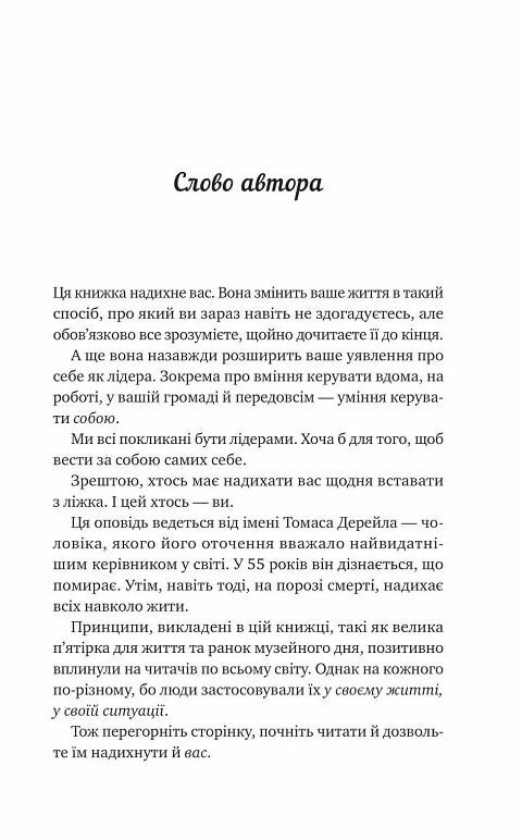 Коли ваш бізнес процвітає, підлеглі вас обожнюють, а клієнти ладні тижнями чекати можливості співпрацювати з вашими компаніями, ви не готові прийняти свою незабарну смерть у 55 років. Чи готові? Джо вирішує провести зі своїм невиліковно хворим наставником останні місяці. І Томас, навіть на порозі смерті, надихає жити та ділиться досвідом. «Ми всі покликані бути лідерами. Хоча б для того, щоб вести за собою самих себе. Зрештою, хтось має надихати вас щодня вставати з ліжка. І цей хтось — ви», — ось ваше потужне нагадування про те, що успішні лідери займаються не лише своєю справою — вони займаються справою життя. Справою, у якій важливі мета існування і попутники. У кожного своя велика п'ятірка для життя, хоча… пункт «подорожі світом» є у великих п'ятірках 95% людей.