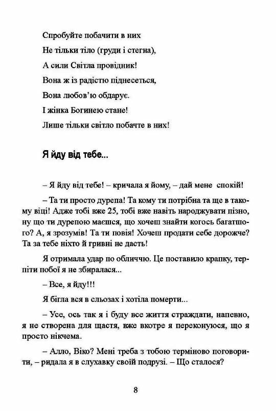"Досить бути гарною дівчинкою. Почни жити" Віталіна Маєнко Жанр: Практична психологія/саморозвиток "Досить бути гарною дівчинкою. Почни жити" Ця книжка потрібна тобі, якщо ти хочеш дізнатися, що насправді думають чоловіки про кохання, секс і зобов’язання, і як ми можемо використати ці знання для своєї користі. У чому полягає і де ховається секрет зваблювання чоловіків? Про це тобі не розповість жодна твоя подруга, ніхто не зізнається, як все насправді! Дізнайся правду про чоловіків і вчися на чужих помилках! Книга допоможе тобі стати мудрішою і досвідченішою у взаєминах з чоловіками, ти не будеш робити одні й ті ж помилки, зможеш створити щасливі стосунки з коханою людиною і знайти свій шлях. У книзі також представлені практичні рекомендації та техніки