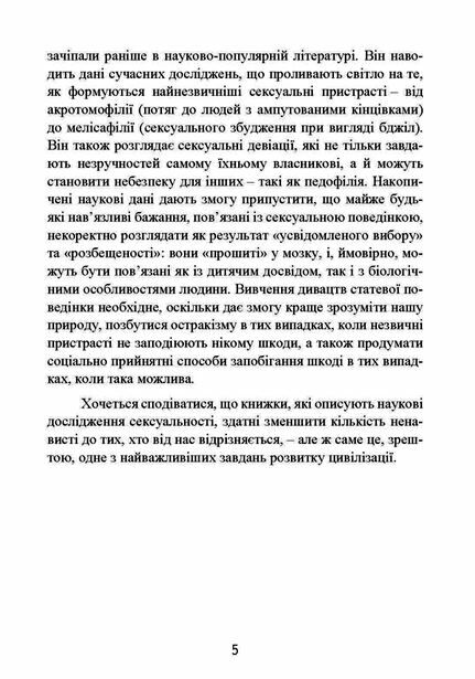 Американський психолог і журналіст веде нас повз вітрини статевого паноптикуму, в яких віддзеркалюємося ми самі, і пропонує тверезо дивитися на дивацтва, які роблять людей різними — і такими схожими.