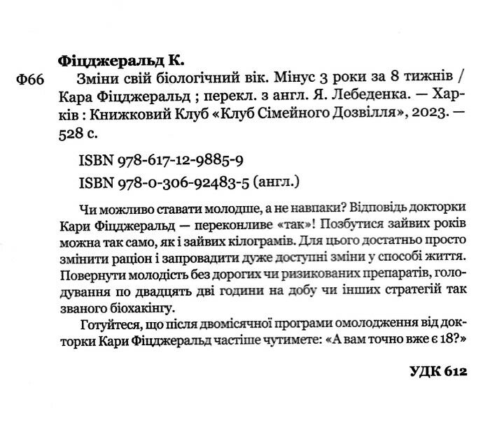 Ставати щодня молодше, а не навпаки... Якась магія? Ні, підтверджена наукою реальність. Бо ж хронологічний вік — не вирок, коли можна повернути назад біологічний годинник. Докторка Кара Фіцджеральд переконує: позбутися зайвих років можна, так само як і зайвих кілограмів. Для цього достатньо просто змінити раціон і запровадити дуже доступні зміни у способі життя. Повернути молодість без дорогих чи ризикованих препаратів, голодування по двадцять дві години на добу чи інших стратегій так званого біохакінгу.