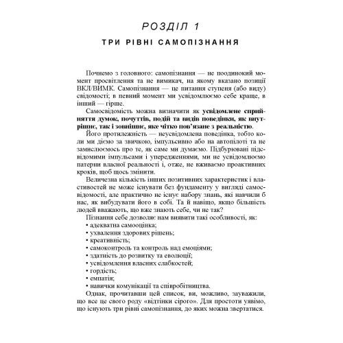 дали, а до самих себе. Цей шлях може бути небезпечним, лякаючим і дискомфортним, але в кінці всіх чекає щедра винагорода. Знання себе не одно знання своєї біографії — необхідно усвідомити, що робить нас щасливими, що змушує сумувати, а ще — які