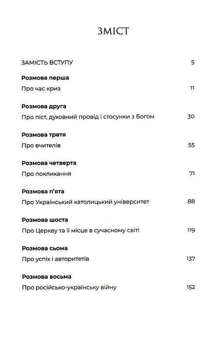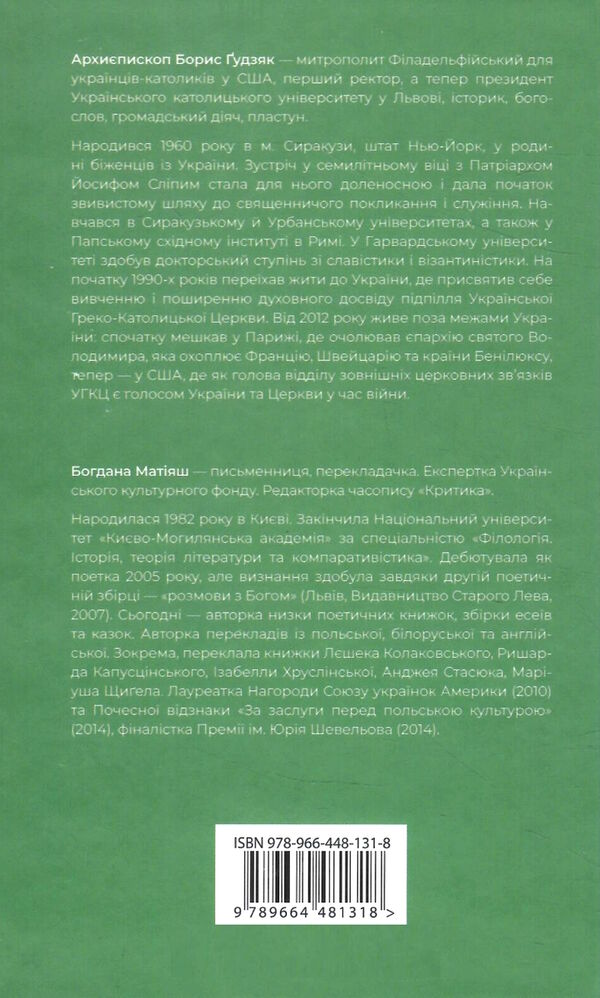 Книжка розмов між духовним авторитетом митрополитом Борисом Ґудзяком і письменницею Богданою Матіяш є нагодою у час війни зосередитися на низці тем, які запрошують до віднайдення в собі самих внутрішнього миру. Вісім розмов, записаних за різних обставин, охоплюють чималий тематичний спектр: це внутрішнє, духовне життя людини та її стосунки з Богом; пошук власного покликання; засади, на яких творився нинішній Український католицький університет у Львові; роль та місце Церкви в сьогоднішньому світі; рефлексії довкола російсько-української війни тощо. У час, коли ми всі зранені війною, духовні пропозиції владики Бориса можуть бути особливо цілющими і життєдайними.