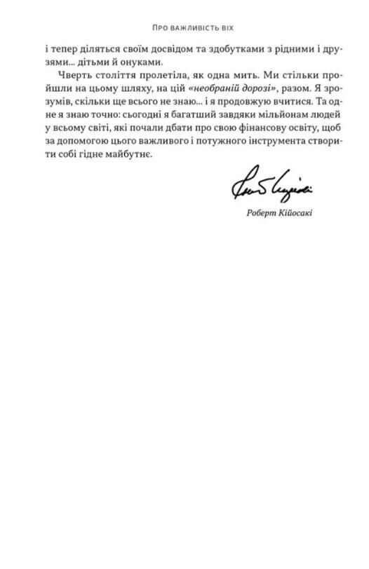 Книжка сповнена жорстокої правди для тих, хто й надалі житиме за сценаріями бідного тата. І водночас має чимало порад від багатого тата для тих, хто хоче діяти й контролювати своє майбутнє, а не просто шукає швидкі рішення.