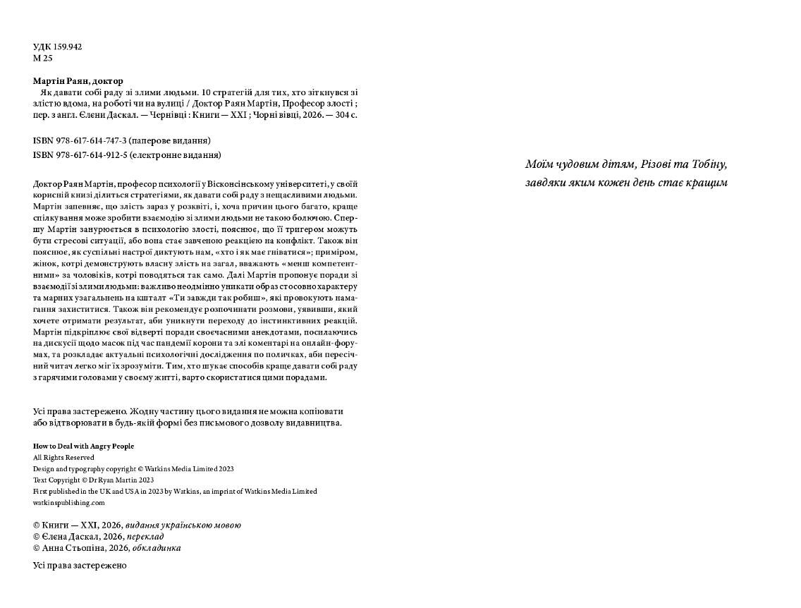Мартін підкріплює свої відверті поради своєчасними анекдотами, посилаючись на дискусії щодо масок під час пандемії корони та злі коментарі на онлайн-форумах, та розкладає актуальні психологічні дослідження по поличках, аби пересічний читач легко міг їх зрозуміти. Тим, хто шукає способів краще давати собі раду з гарячими головами у своєму житті, варто скористатися цими порадами.