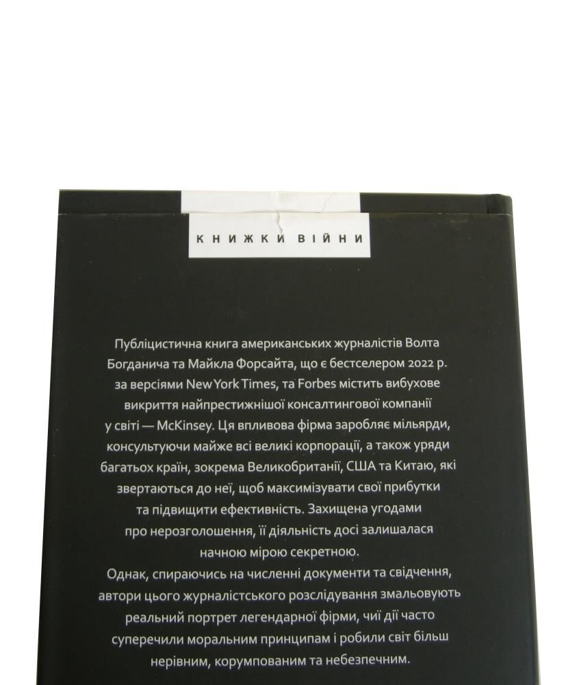 Публіцистична книга американських журналістів Волта Богданича та Майкла Форсайта, що є бестселером 2022 р. за версіями Forbes та New York Times, містить вибухове викриття найпрестижнішої консалтингової компанії у світі — McKinsey. Ця впливова фірма заробляє мільярди, консультуючи майже всі великі корпорації, а також уряди багатьох країн, зокрема Великобританії, США та Китаю, які звертаються до неї, щоб максимізувати свої прибутки та підвищити ефективність. Захищена угодами про нерозголошення, її діяльність досі залишалася значною мірою секретною. Однак, спираючись на численні документи та свідчення, автори цього журналістського розслідування змальовують реальний портрет легендарної фірми, чиї дії часто суперечили моральним принципам і робили світ більш нерівним, корумпованим та небезпечним.