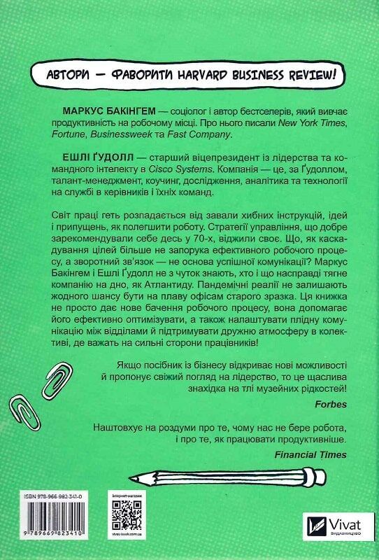 Світ праці геть розпадається від завали хибних інструкцій, ідей і припущень, як полегшити роботу. Стратегії управління, що добре зарекомендували себе десь у 70-х, віджили своє. Що, як каскадування цілей більше не запорука ефективного робочого процесу, а зворотний зв’язок — не основа успішної комунікації? Маркус Бакінгем і Ешлі Ґудолл не з чуток знають, хто і що насправді тягне компанію на дно, як Атлантиду. Пандемічні реалії не залишають жодного шансу бути на плаву офісам старого зразка. Ця книжка не просто дає нове бачення робочого процесу, вона допомагає його ефективно оптимізувати, а також налаштувати плідну комунікацію між відділами й підтримувати дружню атмосферу в колективі, де важать на сильні сторони працівників!