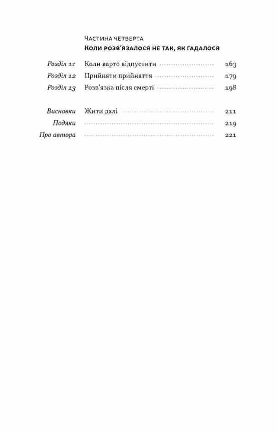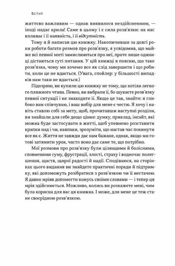 Якщо ви: безрезультатно намагаєтеся поговорити з людиною і з’ясувати, що між вами сталося; прокручуєте в голові фрази, подумки пояснюючи комусь, що відчуваєте; фантазуєте про те, як почуватимуться ваші кривдники, коли нарешті все їм скажете, — тоді ви прагнете розв’язки. І в цьому ви не самотні. У своїй чуйній і проникливій книжці доктор Ґері Макклейн розповідає, як шукати порозуміння здоровими та продуктивними способами, а також як рухатися вперед, коли ми не отримуємо бажаного. Ви дізнаєтеся, як відчути примирення і залишити жаль позаду. Коли не можете припинити думати про сварку з другом або постійно прокручуєте в голові провал на роботі, коли ваш світ перевернувся догори дриґом через розрив стосунків або коли померла кохана людина, терапевтична «Розв’язка» допоможе вам відпустити минуле, перегорнути сторінку та прийняти, нарешті, майбутнє.