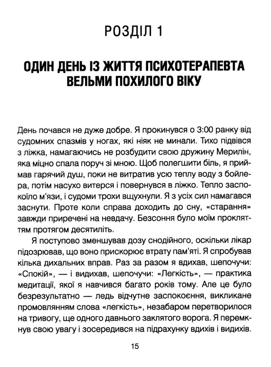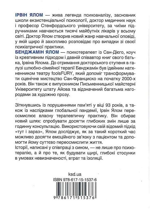 Глибоко зворушлива та відверта хроніка від одного з найвидатніших психотерапевтів сучасності, що розповідає про роботу в абсолютно нових обставинах, виклики та відкриття, яких він досяг. Зіткнувшись із втратою пам'яті у віці 93 років, а також із наслідками глобальної пандемії, Ірвін Ялом переосмислює власну терапевтичну практику. Він обирає новий шлях: спробувати досягти глибоких змін лише за годинну консультацію. Використовуючи свій відомий підхід "тут і зараз", Ялом досліджує, як за такий короткий час можливо досягти глибокого емоційного зв'язку та значущих усвідомлень. Історії, написані у співпраці з сином, психотерапевтом Бенджаміном Яломом, - не лише про психотерапію, а й про те, як будувати щирі, глибокі стосунки в умовах невизначеності, втрат та ізоляції.