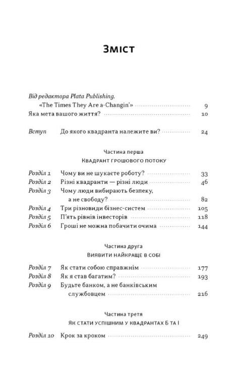 Різниця між цими порадами — не у словах, а в тому, як ви заробляєте гроші. Можна носити воду відрами або ж побудувати власний водопровід. У цій книжці Роберт Кійосакі пропонує просту й водночас революційну модель — квадрант грошового потоку E-S-B-I. Найманий працівник, самозайнятий, власник бізнесу та інвестор — чотири способи отримувати дохід і чотири різні типи мислення. Автор допомагає визначити, у якому секторі перебуваєте зараз ви, та показує шлях переходу до тих квадрантів, де ви знайдете суттєві податкові переваги й де народжується фінансова свобода.