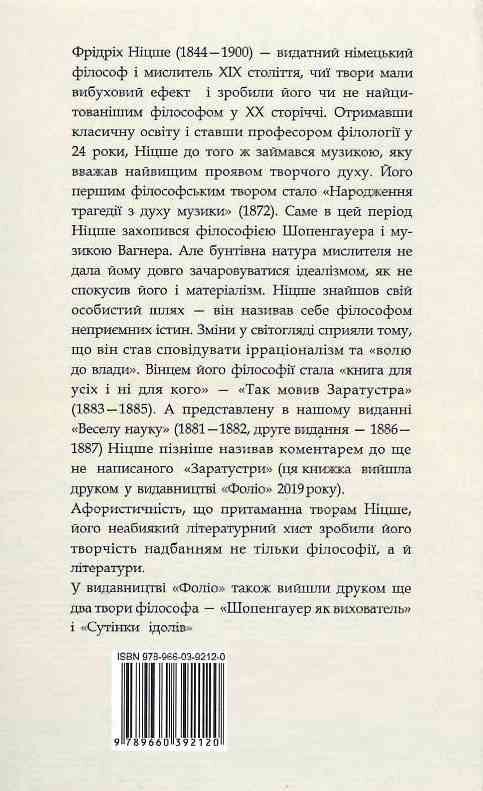 Фрідріх Ніцше (1844—1900) — видатний німецький філософ і мислитель ХІХ століття, чиї твори мали вибуховий ефект і зробили його чи не найцитованішим філософом у ХХ сторіччі. Отримавши класичну освіту і ставши професором філології у 24 роки, Ніцше до того ж захоплювався музикою, яку вважав найвищим проявом творчого духу. Його першим філософським твором стало «Народження трагедії з духу музики» (1872). Саме в цей період Ніцше захопився філософією Шопенгауера і музикою Вагнера. Але бунтівна натура мислителя не дала йому довго зачаровуватися ідеалізмом, як не спокусив його і матеріалізм. Ніцше знайшов свій особистий шлях — він називав себе філософом неприємних істин. Зміни у світогляді сприяли тому, що він став сповідувати ірраціоналізм та «волю до влади». Вінцем його філософії стала «книга для усіх і ні для кого» — «Так говорив Заратустра» (1883—1885). А представлену в нашому виданні «Веселу науку» (1881—1882, друге видання — 1886—1887) Ніцше пізніше називав коментарем до ще не написаного «Заратустри».