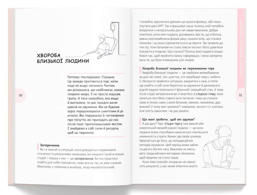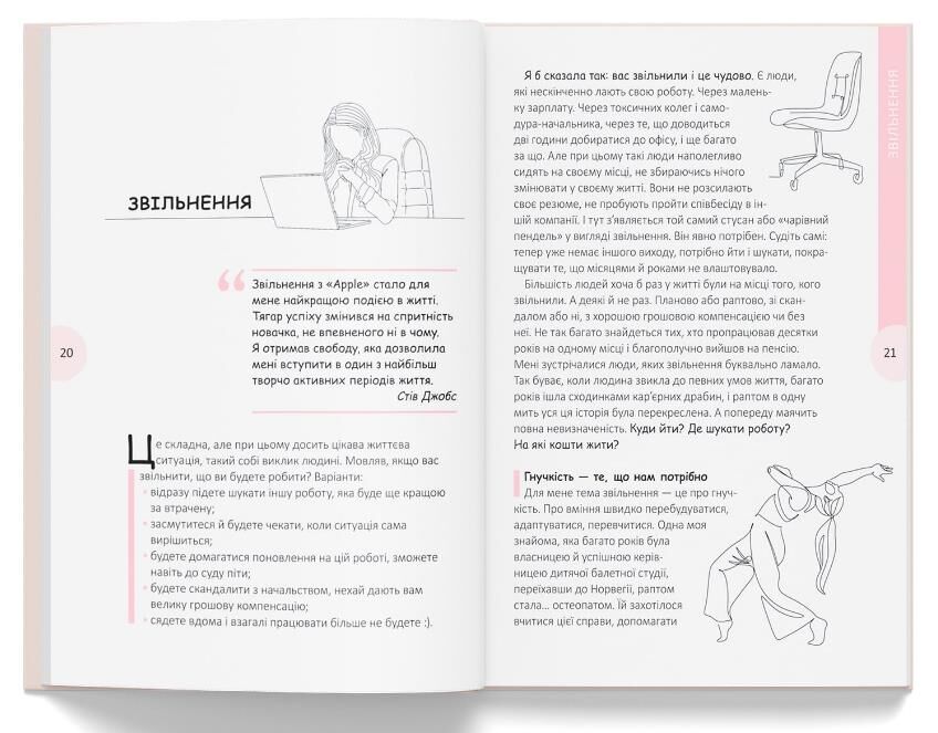 - покрокові інструкції, як діяти під час життєвих криз: зради партнера, втрати роботи, краху бізнесу, хвороби, смерті близької людини, домашнього насильства;