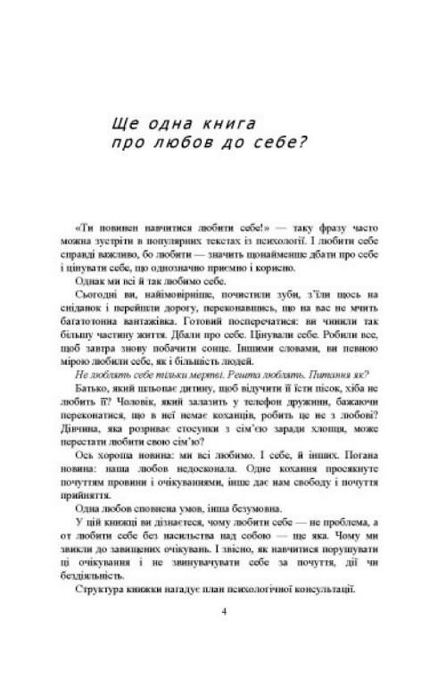 У цій книжці ви дізнаєтеся, чому любити себе — не проблема, а от любити себе без насильства над собою — ще яка. Чому ми звикли до завищених очікувань і, звісно, як навчитися порушувати ці очікування і не звинувачувати себе за почуття, дії чи бездіяльність.