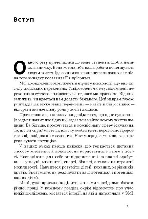 Протягом багатьох років Керол Двек досліджувала силу людських переконань і їхній вплив на наше життя. Намагаючись з’ясувати, чи є талант запорукою успіху, завдяки чому ми досягаємо бажаного і який рецепт розв’язання будь-яких проблем, вона зробила революційне відкриття. Успішність у навчанні й роботі, бізнесі та спорті, мистецький хист і взагалі кожна сфера людського життя можуть змінюватися залежно від того, що саме ми думаємо про власні можливості й таланти. Наші вміння не є сталими, і лише старанність та наполеглива праця здатні призвести до реальних досягнень.