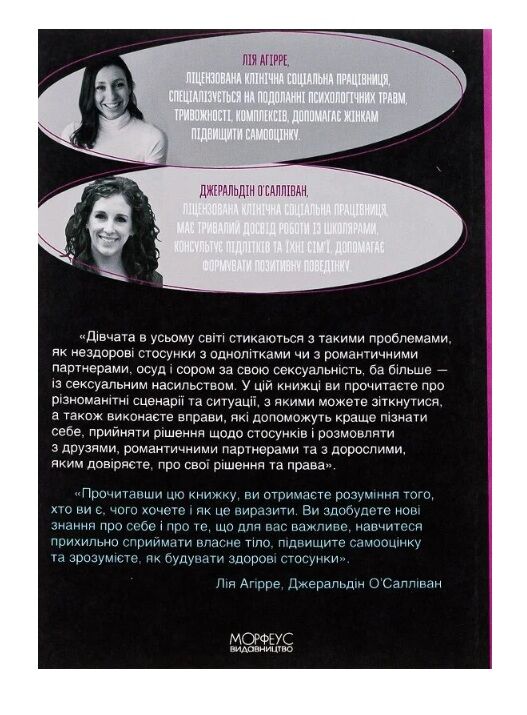 Досвідчені соціальні працівниці Лія Агірре та Джеральдін О’Салліван (США) в доступній формі, з дотриманням конфіденційності аналізують реальні кейси та пропонують інструменти, які допоможуть дівчатам упевнено проходити цей непростий період.