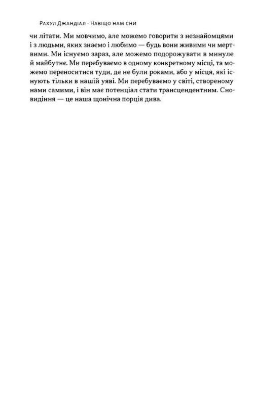 Сучасні дослідження снів наближають ці можливості до реальності. Видатний нейронауковець Рахул Джандіал доводить: сновидіння — основа дивергентного мислення, що існує за межами логіки та часу. З його книжки ви дізнаєтеся, як: визначати, що еротичні сни розповідають про стан реальних стосунків; позбавлятися кошмарів, працювати з ПТСР, депресією та залежностями; активувати усвідомлені сни для отримання інсайтів, навчання та розв’язання проблем; вчасно помічати хвороби (Паркінсона, Альцгеймера, серцеві захворювання тощо);