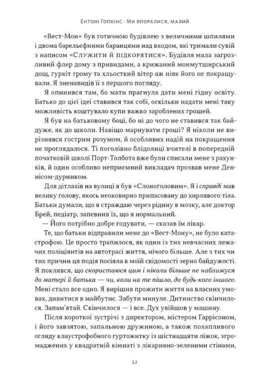 Ентоні Гопкінс також відверто описує найтемніші сторінки свого життя: залежність від алкоголю, невдалі шлюби, зіпсовані стосунки з єдиною дитиною. Ця книжка — щира й пристрасна сповідь складної культової особистості, яка понад шістдесят років надихає публіку своїми видатними ролями.