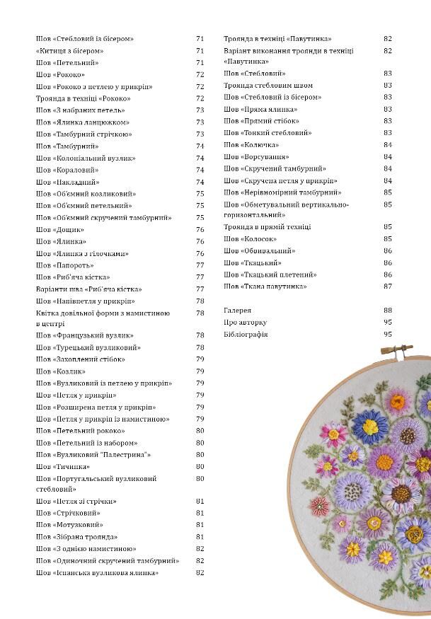 Відкрийте для себе універсальність вишивки за допомогою цього вичерпного посібника й навчіться використовувати будь-які нитки та вишивальні техніки, які ви забажаєте! Дженніфер Клаустон розповідає, як максимально використати нитки, які у вас вже є, представляючи сотні варіантів комбінацій технік і пряжі для створення власного унікального квітника — від текстурованих стебел та листків до барвистих квіткових букетів. Книга містить покрокові ілюстровані інструкції для понад 80 вишивальних технік і 400 їх комбінацій.