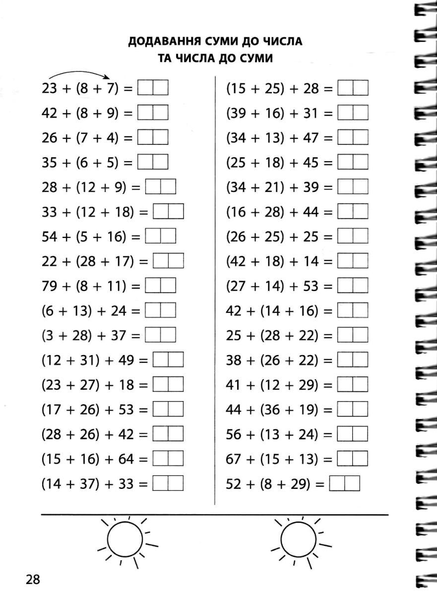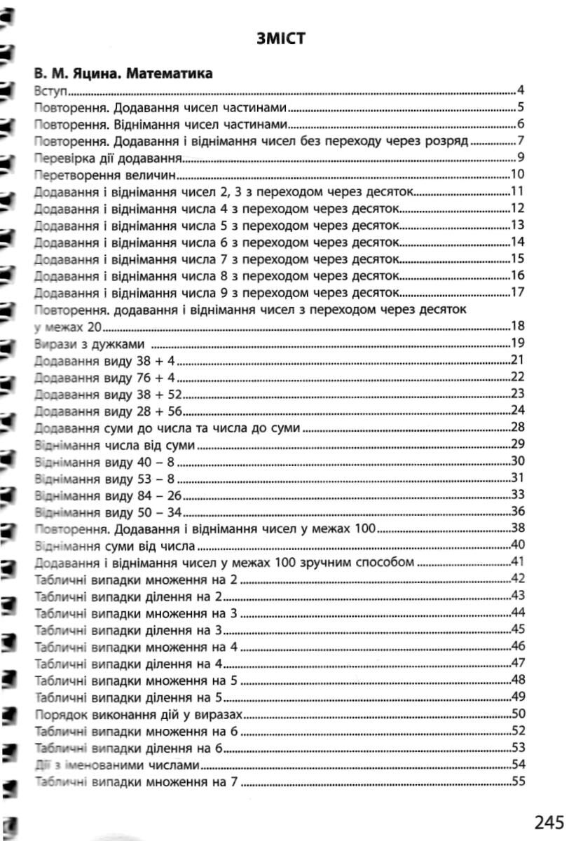 - математика: додавання та віднімання чисел з переходом через десяток, множення і ділення, обчислення виразів з дужками, розв'язування задач тощо;
