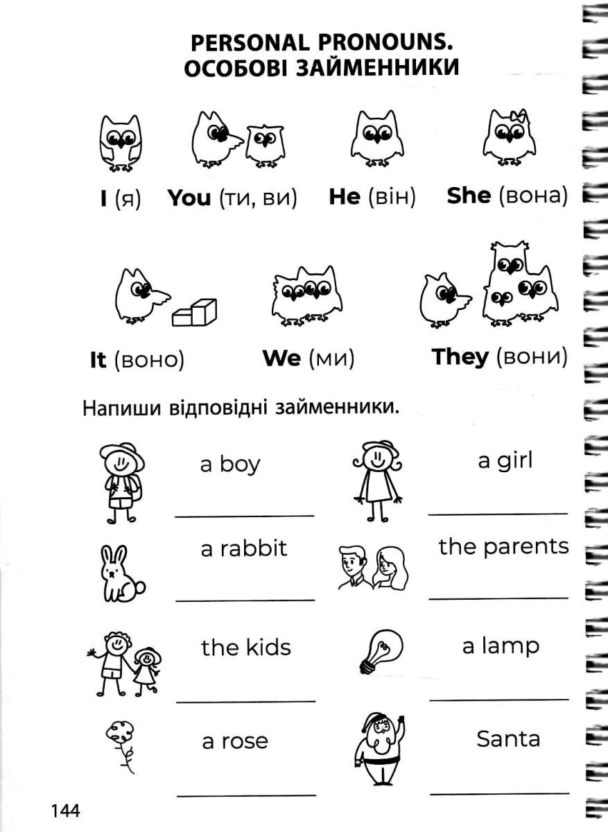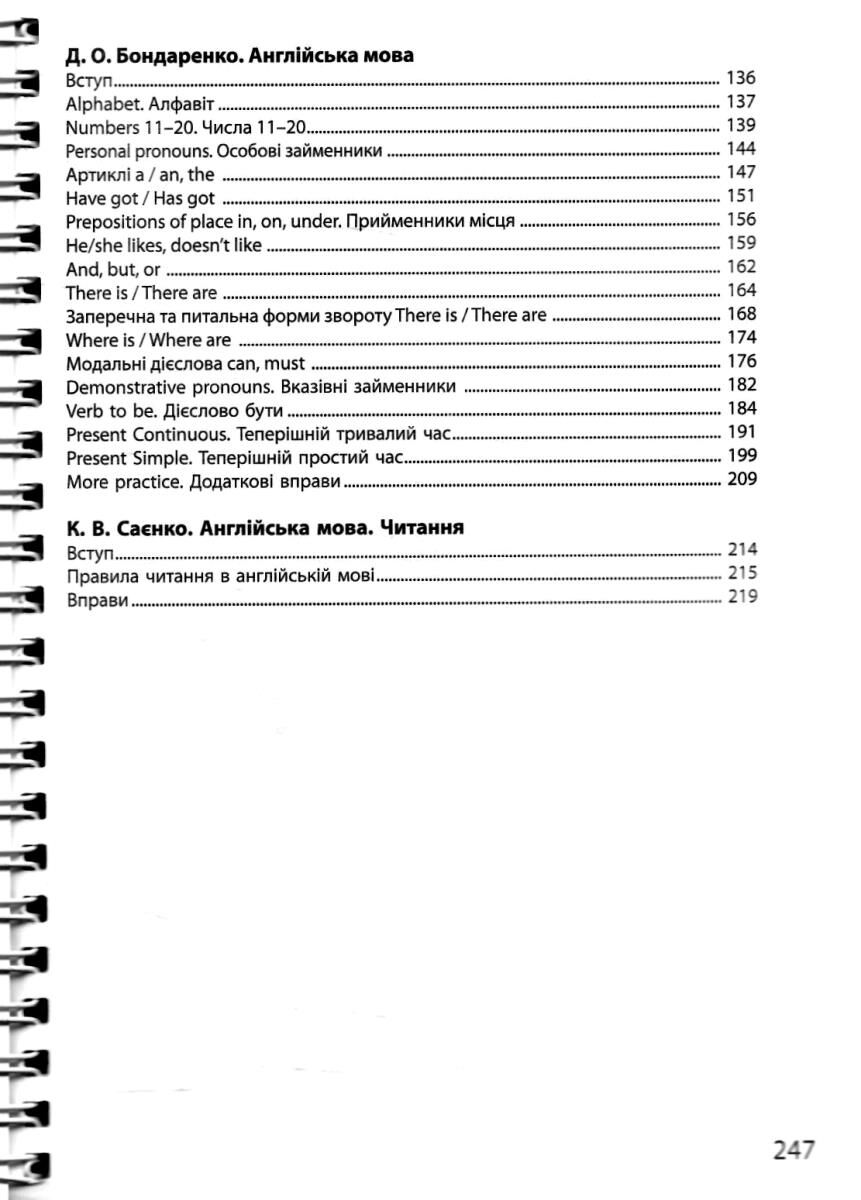 - англійська мова: вживання особових і вказівних займенників, артиклів, прийменників місця, модальних дієслів, утворення заперечних і питальних речень, форм теперішнього тривалого та теперішнього простого часів тощо;