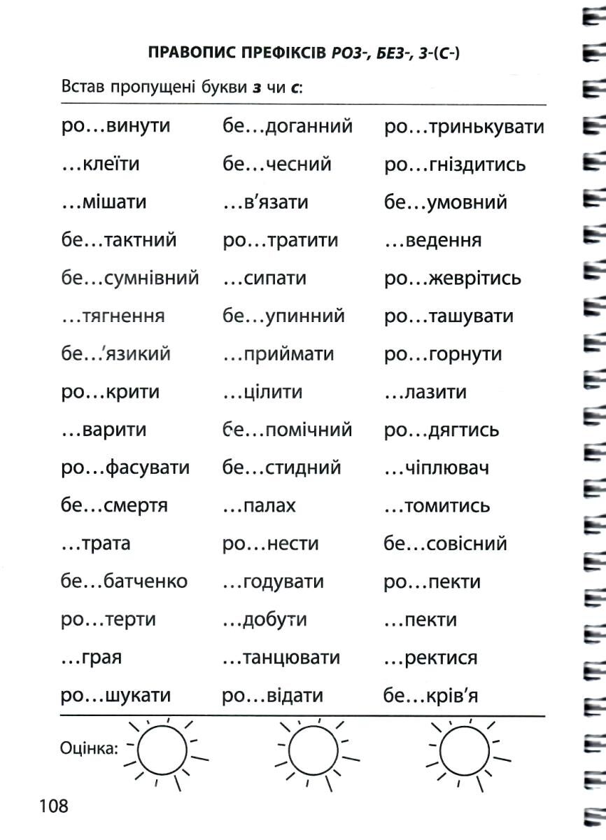 - українська мова: слова-синоніми та слова-антоніми, чергування голосних та приголосних звуків у коренях слів, правопис слів із дзвінкими та глухими приголосними, правопис префіксів, подвоєння букв у результаті збігу приголосних, число та рід іменників, творення іменників та відмінювання іменників, написання не з дієсловами, родові закінчення прикметників тощо;