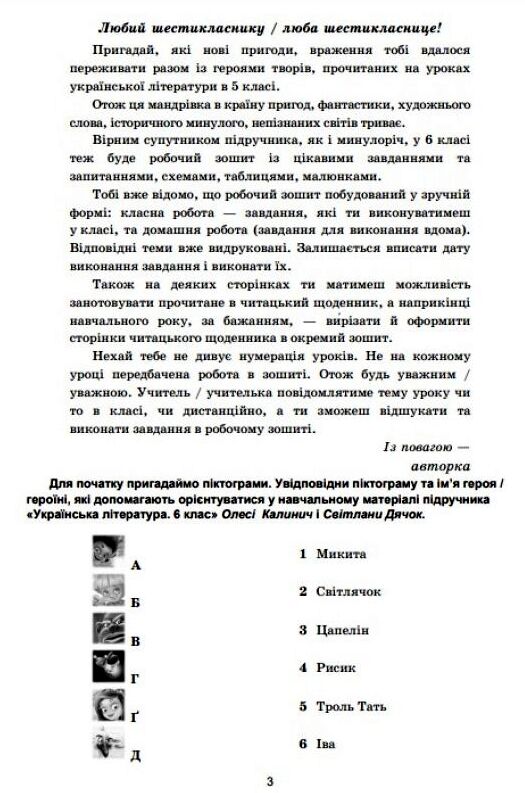 Зошит із друкованою основою складений відповідно до чинної модельної навчальної програми української літератури авторського колективу Яценко Т. О. та до підручника О. Калинич, С. Дячок «Українська література. 6 клас».Зошит містить завдання на формування ключових та предметних компетентностей, на розвиток мовлення, виховання креативного читача-патріота. Структура та змістове наповнення робочого зошита сприятимуть удосконаленню та розширенню знань, умінь і компетент ностей учнів